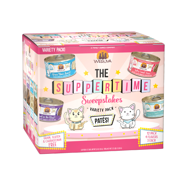 Purchase required to win the joy in your kitty's heart when they sink their teeth into each flavor. Rules and regulations apply - but basically just include buying it, eating it, and loving it. For entry, prize details, and additional rules, don't worry about it. If you tried it, you already won. The Weruva Paté The Suppertime Sweepstakes Variety Pack contains 3 each of: Press Your Lunch!, Meows n' Holler PurrAmid, Jolly Good Fares, Meal or No Deal!