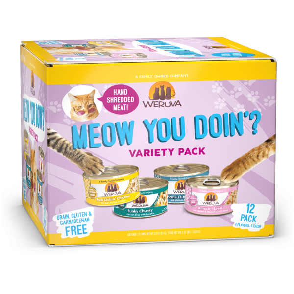 Feline fine, thanks for asking! And if that wasn't true, it's about to be. The joy you'll soon see ripple down kitty's spine as he sinks his teeth into his dinner, with home-cooked flavors he'll think you spent hours on. And when he's happy, you're happy. Weruva's Meow You Doin'? Variety Pack for cats contains 3 each of 4 different recipes - Paw Lickin' Chicken, Funky Chicken, Grandma's Chicken Soup, and Amazon Livin'.