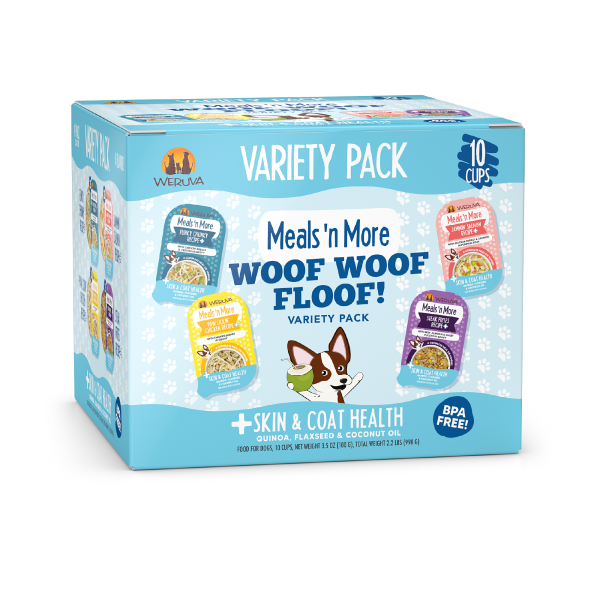 Weruva's Meals 'n More Woof Woof Floof! Variety Pack for dogs contains: 3 Funky Chunky Recipe Plus, 3 Paw Lickin' Chicken Recipe Plus, 2 Jammin' Salmon Recipe Plus, and 2 Steak Frites Recipe Plus. These Meals 'n More recipes provide a lip smackin' meal with added skin & coat support your pup won't want to miss!