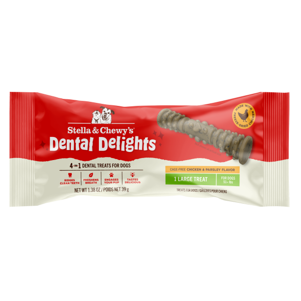 Stella & Chewy's believes that selecting the best food & treats for your pet is one of the most important decisions you can make for their daily health. That's why these new Dental Delights Cleaning Treats are made with natural, wholesome ingredients like rice, freeze-dried, cage free chicken, & parsley, making daily teeth cleaning fun, healthy, & delicious. It helps clean plaque with the nubs & ridges that scrape teeth during chewing, is designed to help dog paws grip & hold while chewing, and is infused with peppermint & parsley to freshen doggie breath. Designed for dogs over 51 pounds.