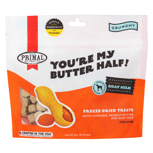 Give your "butter half" something to bark about with thoughtfully-sourced chicken, nutty peanut butter, goat milk, and gut-supporting probiotics. Primal's You're My Butter Half dog treats have a crunchy texture and are free from corn, wheat, soy, grains, gluten, and artificial preservatives, flavours, and additives.