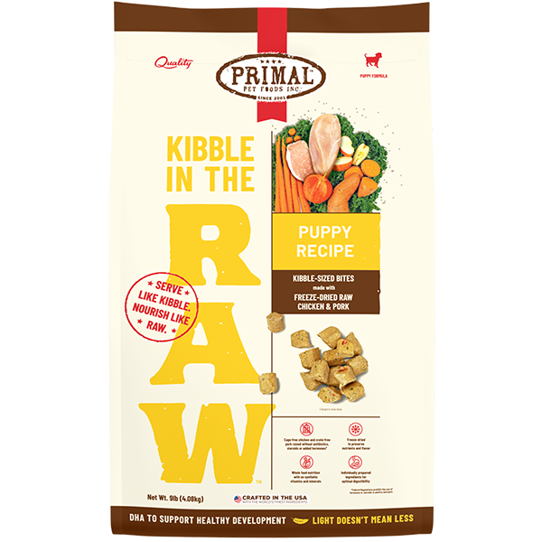 Kibble in the Raw Puppy Recipe is made with cage-free chicken, crate-free pork and organic produce with no synthetic vitamins, minerals or artificial ingredients to provide real, whole food nutrition. Kibble sized bites made with high-quality raw chicken and pork are freeze-dried to preserve nutrients and flavor. Experience the same scoop and serve feeding experience as kibble, while delivering optimal nutrition & digestibility for your puppy. Kibble in the Raw is nutrition and convenience in perfect harmony. Serve like kibble. Nourish like raw.