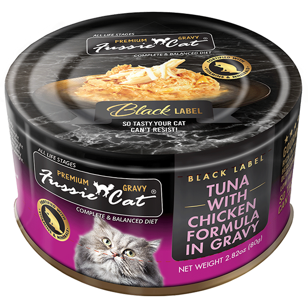 Fussie Cat Black Label Tuna with Chicken Formula in Gravy is rich in DHA to help support healthy vision and brain development and is fortified with vitamins and minerals. This protein first recipe is high in moisture and helps boost daily hydration with a delectable gravy.