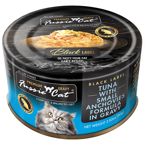 Fussie Cat Black Label Tuna with Small Anchovies Formula in Gravy is rich in DHA to help support healthy vision and brain development and is fortified with vitamins and minerals. This protein first recipe is high in moisture and helps boost daily hydration with a delectable gravy.