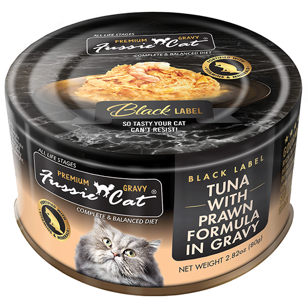 Fussie Cat Black Label Tuna with Prawns Formula in Gravy is rich in DHA to help support healthy vision and brain development and is fortified with vitamins and minerals. This protein first recipe is high in moisture and helps boost daily hydration with a delectable gravy.