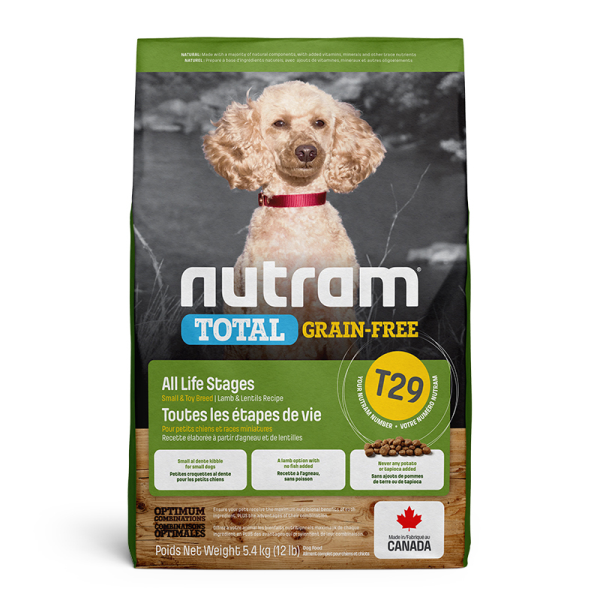Canadian Brand. T27 Nutram Total Grain-Free Chicken & Turkey Dog Food for Small & Toy Breed Dogs is a holistic, multi-beneficial, and nutrient-rich recipe that improves your pet's wellness from the inside-out. A blend of low-glycemic lentils, peas & chickpeas supply a source of healthy carbs & quality protein, real lamb provides a gentle protein source and, together with Quinoa, provides the body with all the tools it needs for strong muscles. Chicory root promotes the growth of natural intestinal bacteria, while pumpkin is rich in fiber, assisting with movement of food through the digestive system.