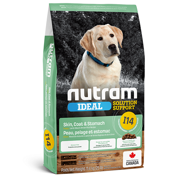 Canadian Brand. I14 Nutram Ideal Solution Support Skin, Coat and Stomach Dog Food with Lamb & Rice. This Holistic food starts with digestion through a special combination of easy to digest wholesome proteins, such as real Lamb, which combined with Pumpkin, a great fiber source, promotes the optimal environment for sensitive stomachs. Nutram's Optimum Combinations also offer Flaxseed and Salmon Oil, rich sources of Omega-3 fatty acids, support the normal cognitive development in your young pet. You can be confident that your pets food is healing, wholesome and the ideal nutritional choice.