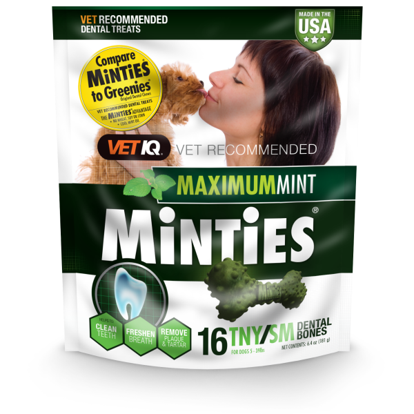 Minties Dental treats provide vet recommended dental care for your dog. Each delicious bone has a triple action formula to help clean teeth, promote fresh breath and help reduce plaque and tartar. Minties are made in the USA with no wheat, gluten, soy, corn, artificial flavors and animal by-products. The unique hardness, shape and texture keep your dog's teeth clean and healthy as he chews. Each treat contains five natural ingredients - peppermint, parsley, dill, fennel and alfalfa, that work in your dog's mouth and stomach to promote fresh breath and reduce unpleasant odors.