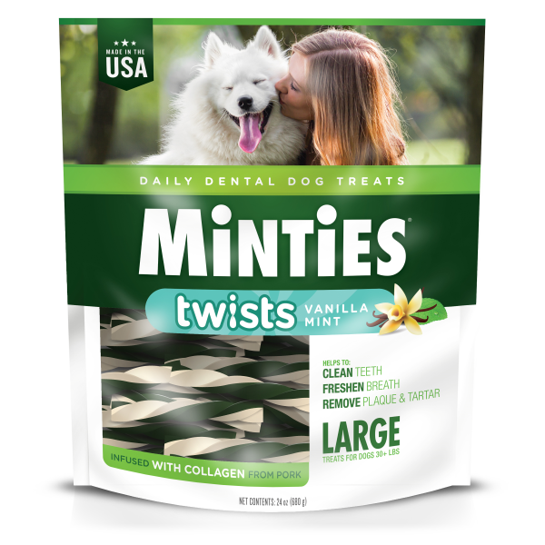 With a delicious blend of peppermint and vanilla, Minties Twists are flavorful treats designed to give your dog fresh breath and a sparkling smile. Minties Twists help remove plaque and tartar by the mechanical action of chewing.