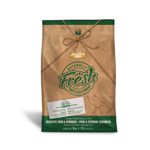 Canadian Brand. Wholesome Blend Naturally FRESH -Turkey & Rabbit SENSITIVE STOMACH is formulated to provide carefully balanced nutrients required for your adult cat. They use non-rendered, fresh CanadianTurkey & Rabbit. Nutritious ancient grains, such as pearled millet, quinoa & pearled barley, remain true to their origins. Selected fruits & veggies provide a source of Phytonutrients. A unique blend of pre & probiotics enhances digestibility. Added Sodium Tripolyphosphate provides oral support. Naturally FRESH uses NO wheat, potato, corn, soy, rendered meats, by-products or artificial preservatives.