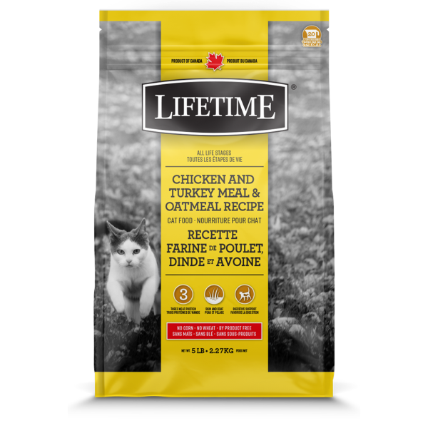 Canadian Brand. Filled with Canadian chicken, turkey and fish, wholesome grains and prebiotics, Lifetime's Chicken, Turkey Meal & Oatmeal recipe encourages optimal urinary health and digestion for your cat or kitten. Canadian chicken meal contains all the essential amino acids for muscle growth and maintenance. Nutritious grains contain several essential nutrients and dietary fiber. Herring oil is a source of DHA, helping improve learning ability and slow cognitive decline in aging companion animals. Yucca Schidigera helps reduce stool odour.