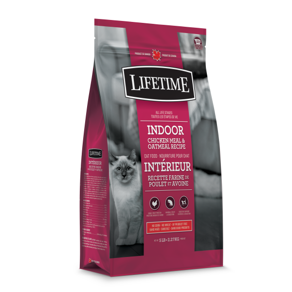 Canadian Brand. With added support for hairball control, Lifetime's Indoor Chicken Meal & Oatmeal is a tasty recipe specially formulated for indoor cats to encourage optimal urinary health and digestion. Canadian chicken meal contains all the essential amino acids for muscle growth and maintenance. Nutritious grains contain several essential nutrients and dietary fiber. Powdered cellulose, a component of plants, is a natural fiber that helps remove ingested hair through the feces, reducing hairballs. Yucca Schidigera helps reduce stool odour.