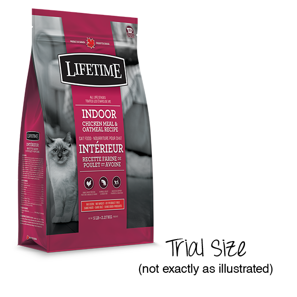 Canadian Brand. With added support for hairball control, Lifetime's Indoor Chicken Meal & Oatmeal is a tasty recipe specially formulated for indoor cats to encourage optimal urinary health and digestion. Canadian chicken meal contains all the essential amino acids for muscle growth and maintenance. Nutritious grains contain several essential nutrients and dietary fiber. Powdered cellulose, a component of plants, is a natural fiber that helps remove ingested hair through the feces, reducing hairballs. Yucca Schidigera helps reduce stool odour.