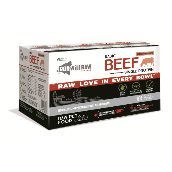Canadian Brand. Iron Will Raw's Basic Beef is a rich, single protein blend of high grade beef muscle meat, beef organs and green beef tripe. It makes an excellent base for pet parents who like to add in their own fruits and vegetables to their pet's bowl. Ingredients - beef meat, beef heart, green beef tripe, ground beef bone, beef liver, beef kidney, and beef spleen.