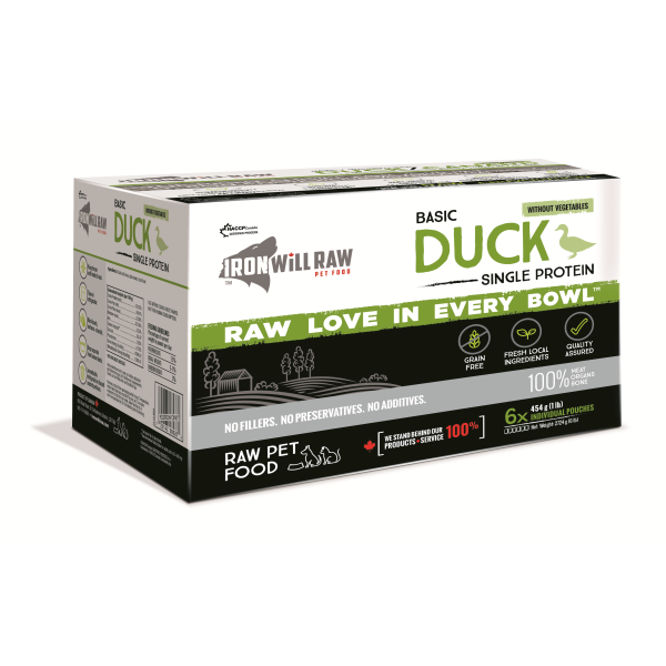 Canadian Brand. Iron Will Raw's Basic Duck is one of their most popular menu items for cats. Felines love the taste of this taurine-rich blend. Duck is an excellent low-fat option that is rich in iron and amino acids, making it a go-to choice for many of their feline customers. Ingredients - duck and bone, duck meat, and duck liver.