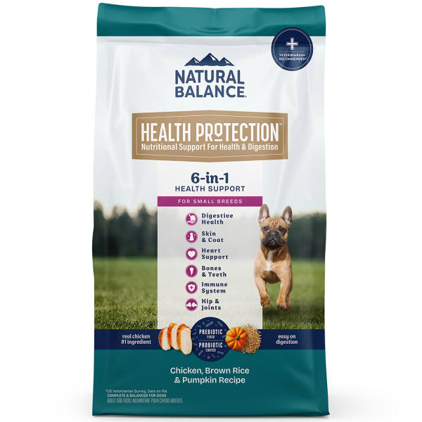 Health Protection Small Breed Dry Dog Food made with Real Chicken, Brown Rice & Pumpkin is developed by veterinarian and nutrition experts to provide your dog with complete and balanced nutrition that supports whole-body health and digestive wellness. Each bite contains natural prebiotic fiber and probiotics to support digestive wellness, and a healthy microbiome. Formulated to meet the nutritional needs of your growing puppy, every delicious bite is rich in nutrients and the perfect size for smaller jaws & teeth.