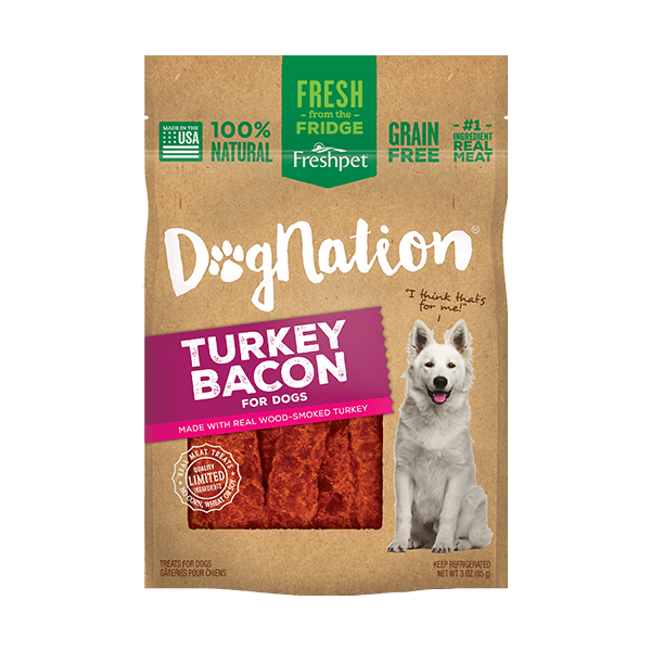 Freshpet Dognation Turkey Bacon Treats are made of all natural, wood-smoked turkey. These turkey bacon treats are fresh from the fridge and downright delicious. Never made with corn, wheat, or soy, Dognation treats are all-natural and 100% mouth-watering. Made in the U.S.A. with no ingredients from China.