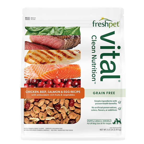 Freshpet Vital Grain Free Complete Meals for Dogs was created to mimic the ancestral eating habits of dogs with the benefits of leading edge nutrition. This recipe is made of fresh chicken, beef and salmon, with accents of cranberries and spinach to give your dog the nutritional balance he needs. This grain-free recipe is made with at least 80% animal protein, and comes in a resealable bag that makes feeding and storing easy.