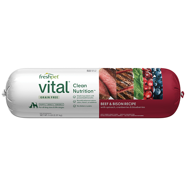 Freshpet Vital Grain Free Beef and Bison was created to mimic the ancestral eating habits of dogs with the benefits of leading edge nutrition. This recipe includes hearty proteins like beef and bison, as well as antioxidant-rich blueberries and cranberries. At least 80% animal protein, this grain-free recipe satisfies the carnivore within your pup. And Vital's slice and serve rolls makes feeding easy.