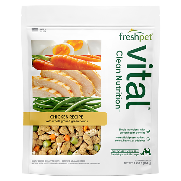 Vital Dog Balanced Nutrition Chicken starts with natural US farm-raised chicken, then added whole grain & prebiotics to support digestive health, and omega 3 fatty acids to support skin & coat. Gently cooked with carrots & green beans, it's a ready-to-serve meal that's complete & balanced for all life stages. Verified Non-GMO.