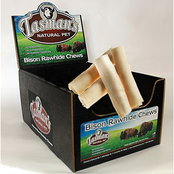 Tasman's POP Small Roll Shelf Display boxes contain individually shrink wrapped and UPC coded product. Tasman's Premium Small Buffalo Rawhide Rolls are made from free-range US Bison with no chemicals, no hormones and no antibiotics. The Small Rolls are approximately 4 - 5 inches long. Great for dogs with allergies or for owners who want to provide their pet with an all-natural diet, even when it comes to treats!