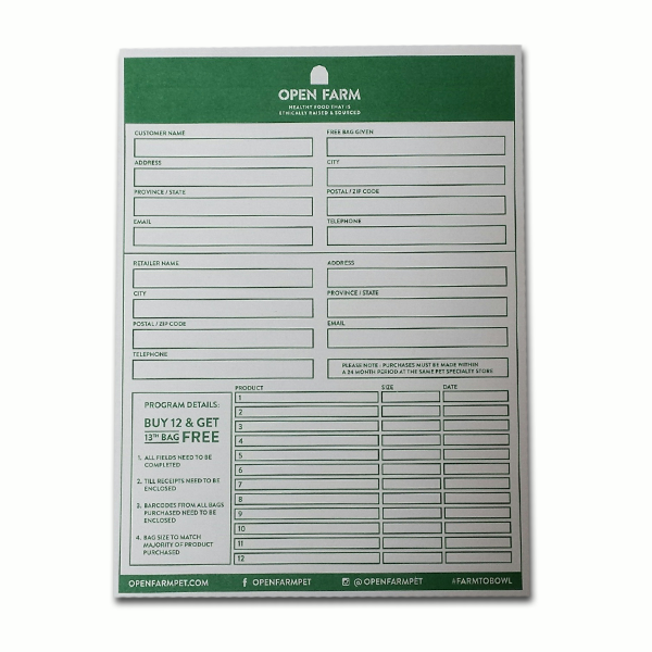The Open Farm Frequent Buyer Envelopes make it easy to store the required UPC codes for proof of purchase. The program rewards your customers with a FREE bag after purchasing 12 bags.