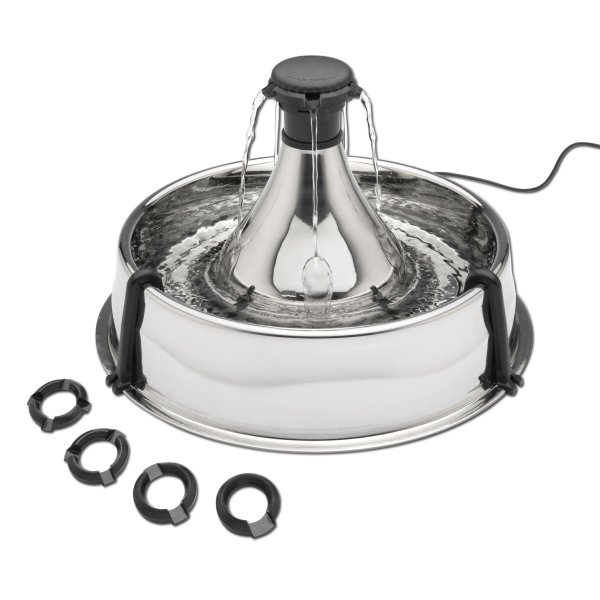 The Drinkwell 360 Stainless Steel Fountain is designed for cats and small or medium dogs. Multiple free-falling streams of water entice your pet to drink more and continually aerate the water with healthful oxygen. A replaceable charcoal filter removes bad tastes & odors, giving your pet the best way to stay hydrated. The 360's multiple streams & circular design allows pets to drink from any angle and is great for multiple pet households. Stainless steel is preferred by vets as the most hygienic pet dish. This unit is dishwasher safe, excluding pump. Replacement filters 298-14356 & 298-14089.