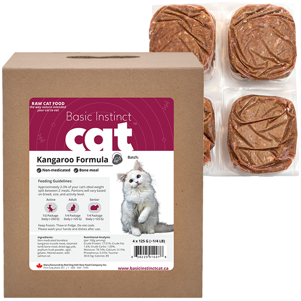 Canadian Brand. Basic Instincts Cat Kangaroo formula is not a typical meat that you'd think of for a cat, however this protein source has cats asking for more! This Kangaroo formula was designed for cats with severe allergies, and only contains kangaroo muscle meat as a single source meat protein (also contains steamed lamb bone meal as a calcium source). Kangaroo meat is much lower in fat and higher in taurine. For any cat with extreme food sensitivities or allergies, Kangaroo provides a true game meat, but must be fed with other formulas or supplementation as this formula does not contain organ meats.