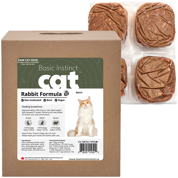 Canadian Brand. Basic Instincts Cat Rabbit formula is a good choice for owners seeking a lean meat for their cat. Formulated using the whole rabbit, this meal provides a good distribution of muscle fibers. Rabbit is particularly good for its calcium-to-fat ratio, and is a well-suited protein for inclusion in a maintenance diet.