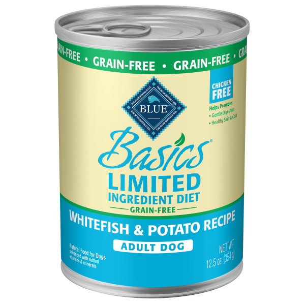 BLUE Basics LID Grain-Free Whitefish & Potato Recipe for Adult dogs is a limited-ingredient diet formulated to minimize food sensitivities that some dogs experience while maximizing the nutritional value they receive. This chicken-free recipe helps promote gentle digestion and healthy skin and coat.