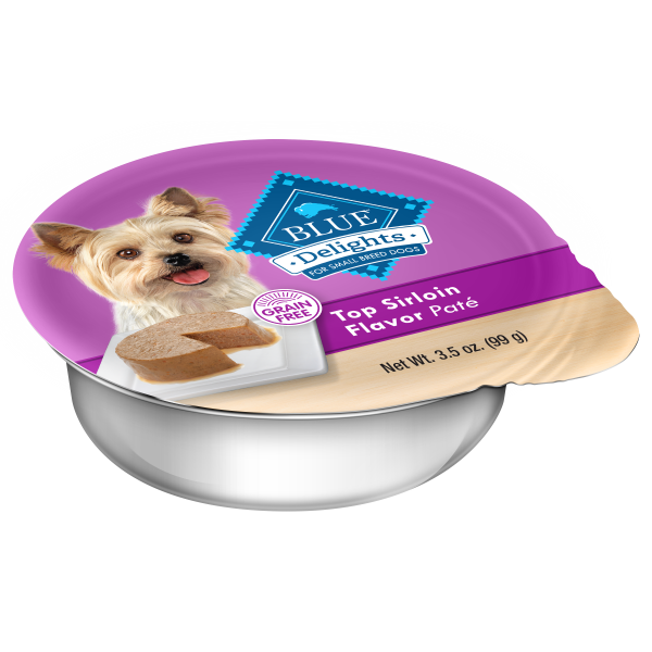 BLUE Delights are scrumptious and nutritious single-serving entrées ideal for small dogs. BLUE Delights Top Sirloin Flavor Paté is made using the finest natural ingredients enhanced with vitamins and minerals. It features high-quality beef in savory juices plus potatoes, carrots, and peas. This natural, gourmet flavor contains no chicken (or poultry) by-product meals, no corn, no wheat, no soy, and no artificial preservatives or flavors.
