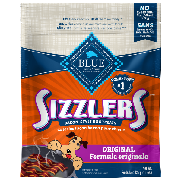 If your dog loves bacon, he'll beg for BLUE Sizzlers, the bacon-style treat featuring real USA pork as the first ingredient. These great-tasting, natural treats are free of the grains that contain gluten.