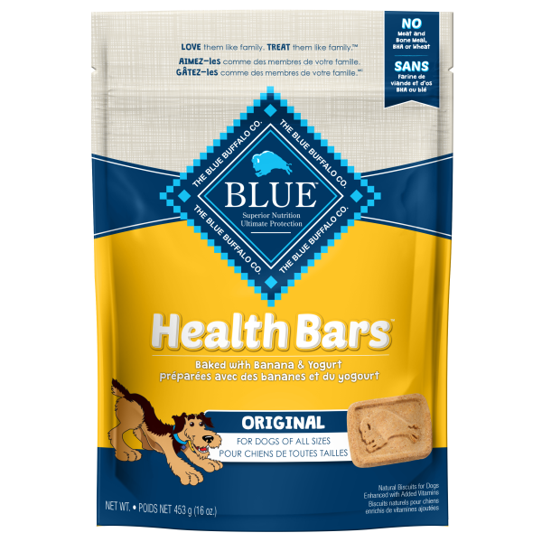 Tasty and wholesome BLUE Health Bars with Banana and Yogurt have a crunchy texture your dog will love. Wholesome whole grains and nutritious fruits and vegetables work together to help keep him healthy.
