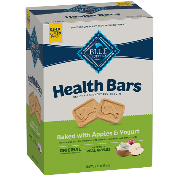 Tasty and wholesome BLUE Health Bars with Apples and Yogurt have a crunchy texture your dog will love. Made with healthy ingredients including wholesome whole grains like oatmeal and barley, and nutritious real apples and yogurt so you can feel good about treating and helping to keep them happy and healthy.