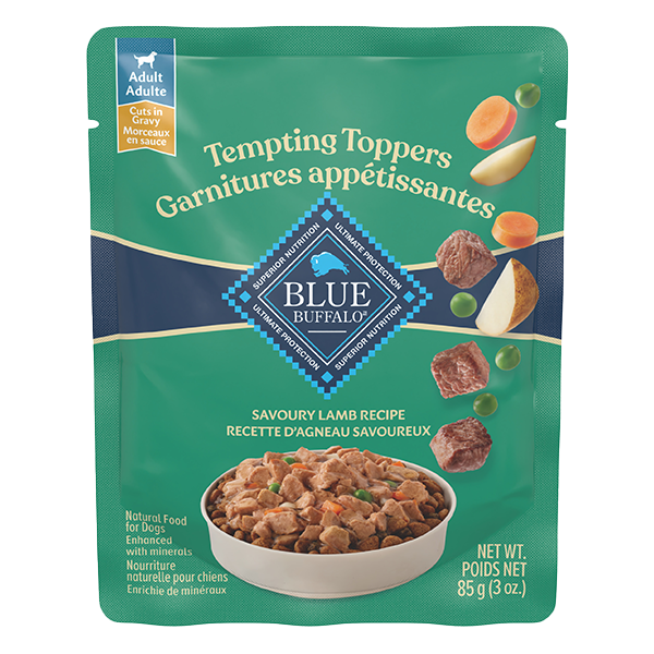 Irresistible BLUE Tempting Toppers Lamb wet dog food starts with high-quality lamb steeped in a savory broth with nutritious veggies. A flavorful addition to your dog's Blue Buffalo dry food, Tempting Toppers can be served as a tasty meal topper, mix-in or healthy snack on its own. Available in handy, single-serve pouches that are easy to open and store, Tempting Toppers make mealtime quick and convenient for you and delicious for your dog.