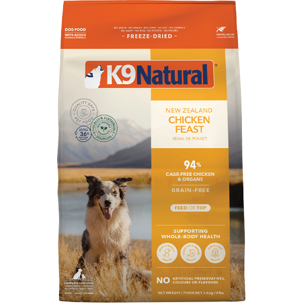 Complete and balanced Freeze-Dried New Zealand Chicken Feast contains 94% Cage-Free Chicken and Organs with New Zealand Green Mussels, Flaxseed Flakes, Vegetables, Oils, Kelp, Vitamins, and Minerals in support of your dog's whole-body health. This food supports joint & muscle health, digestive & immune health, & skin & coat health, all with a taste your dog will love!