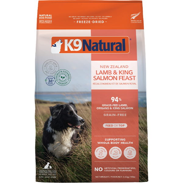 Complete and balanced Freeze-Dried New Zealand Lamb & King Salmon Feast contains 94% Grass-fed & Grass-finished Lamb & Organs, and Sustainably-caught King Salmon, with New Zealand Green Mussels, Flaxseed Flakes, Vegetables, Oils, Kelp, Vitamins, and Minerals in support of your dog's whole-body health. This food supports joint & muscle health, digestive & immune health, & skin & coat health, all with a taste your dog will love!