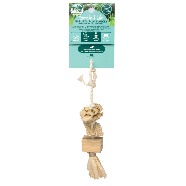 Enriching your pet's daily life starts with supporting natural behaviors such as exploring, playing, hiding, and chewing. Oxbow Enriched Life is designed with these natural behaviors in mind and is constructed from 100% pet-safe materials, allowing you to nurture your pet's mind and body in safe and fun ways every day. The Natural Play Dangly is great for attaching to the habitat and promotes essential chewing behaviors for dental health.