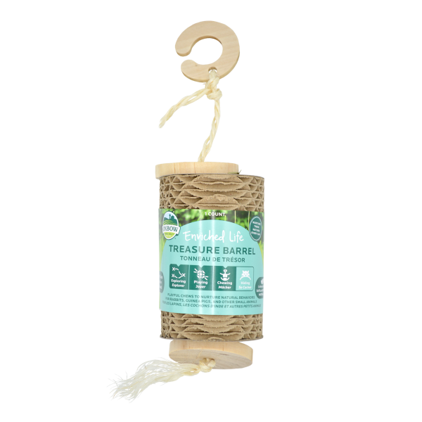 Enriching your pet's daily life starts with supporting natural behaviors such as exploring, playing, hiding, and chewing. The Treasure Barrel is perfect for hiding treats and hay, easily attaches to the habitat & is a great addition to every rabbit, guinea pig, or small pet's habitat. Safe chewing materials promote essential dental wear & provides fun while preventing boredom.