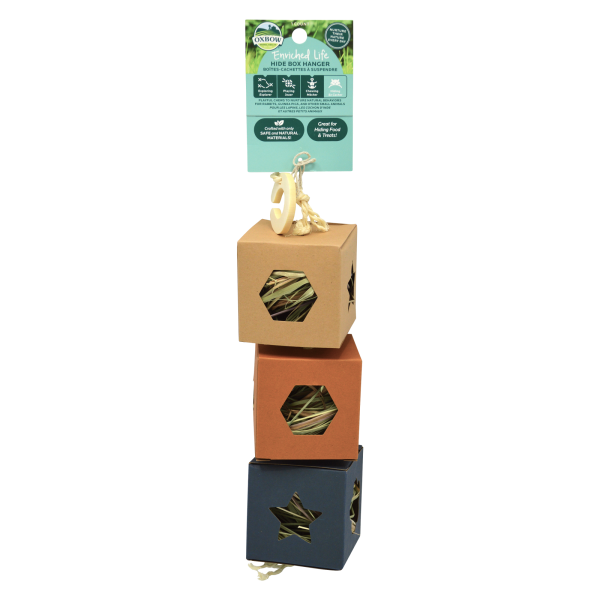 Enriching your pet's daily life starts with supporting natural behaviors such as exploring, playing, hiding, and chewing. Oxbow Enriched Life is designed with these natural behaviors in mind and is constructed from 100% pet-safe materials, allowing you to nurture your pet's mind and body in safe and fun ways every day. The Hide Box Hanger easily attaches to the habitat and are crafted with only safe and natural materials. The hanging boxes contain a variety of ideal chewing materials.