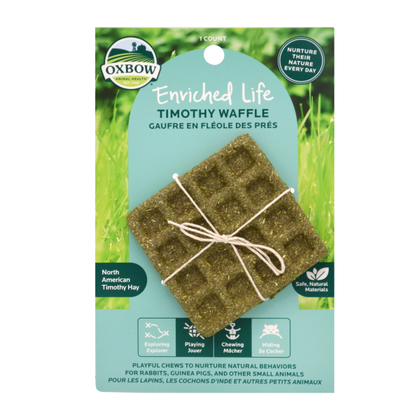 Enriching your pet's daily life starts with supporting natural behaviors such as exploring, playing, hiding, and chewing. Oxbow Enriched Life is designed with these natural behaviors in mind and is constructed from 100% pet-safe materials, allowing you to nurture your pet's mind and body in safe and fun ways every day. The Timothy Waffle is in a fun shape made with high fiber Timothy hay. It is great for supporting your pet's instinctual chewing and playing behaviours.