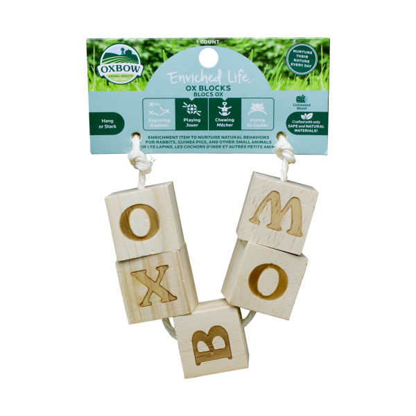 Enriching your pet's daily life starts with supporting natural behaviors such as exploring, playing, hiding, and chewing. Oxbow Enriched Life is designed with these natural behaviors in mind and is constructed from 100% pet-safe materials, allowing you to nurture your pet's mind and body in safe and fun ways every day. The Ox Blocks can be hung or stacked for enriching play. Made of natural wood, they blocks make a great addition to your pet's enrichment routine.