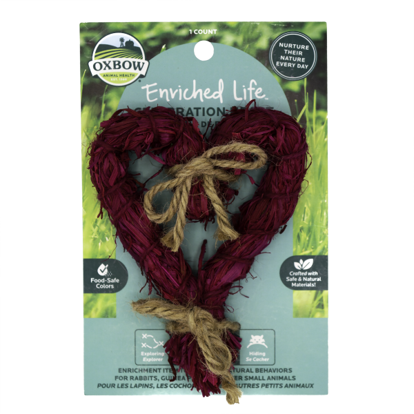 Enriching your pet's daily life starts with supporting natural behaviors such as exploring, playing, hiding, and chewing. Oxbow Enriched Life is designed with these natural behaviors in mind and is constructed from 100% pet-safe materials, allowing you to nurture your pet's mind and body in safe and fun ways every day. The Celebration Heart is in a fun heart shape your pet will love and is made with a variety of safe & natural materials.