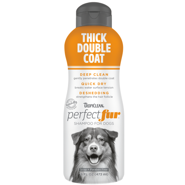 TropiClean Perfect Fur Thick Double Coat Shampoo provides a deep clean, speeds drying time, and strengthens the hair follicle to aid in deshedding. Perfect Fur Shampoo contains no soap, paraben or dyes and has a sweet citrus fragrance. It is specially formulated for the double-layered fur of German Shepherds, Australian Shepherds, Pomeranians, Siberian Huskies, and other breeds with a short undercoat and longer overcoat.