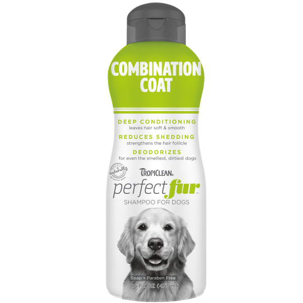 TropiClean Perfect Fur Combination Coat Shampoo provides deep conditioning, reduces shedding, and deodorizes. Perfect Fur Shampoo contains no soap, paraben or dyes and has a sweet citrus fragrance. It is specially formulated for the multifaceted fur of Golden Retrievers, Border Collies, Brittany Spaniels, Cocker Spaniels, and other breeds with long hair at the ears, tail and legs, complemented by a shorter double coat on the body.