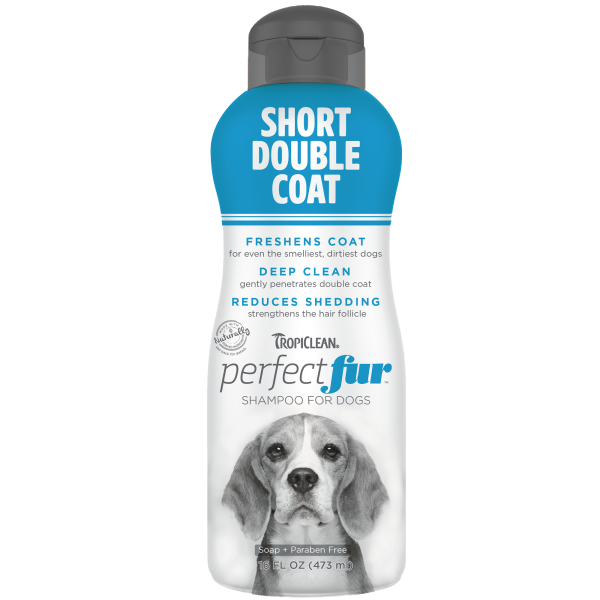TropiClean Perfect Fur Short Double Coat Shampoo freshens coat, deep cleans, and reduces shedding. Perfect Fur Shampoo contains no soap, paraben or dyes and has a sweet citrus fragrance. It is specially formulated for Labs, Pugs, Beagles, Rottweilers and other breeds with two layers of short fur.