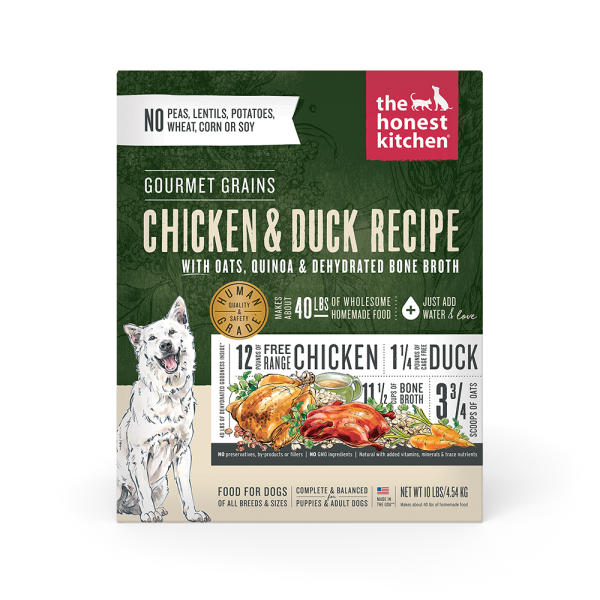 The Honest Kitchen believes human grade, whole foods provide pets the best nutrition possible. This Gourmet Grain recipe is made from ingredients you'd recognize in your own kitchen, like free range chicken, cage free duck, organic oats, and quinoa - all dehydrated to retain nutrients and taste. Perfect for picky eaters, they add a big burst of flavorful bone broth and leave out the potatoes, peas, lentils, corn, wheat, and soy. Just add warm water and wait three minutes for a tasty, homemade meal that you and your pets will love!
