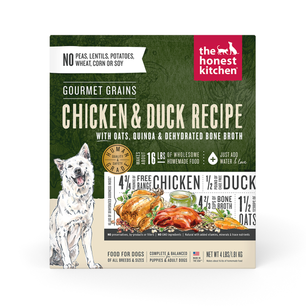 The Honest Kitchen believes human grade, whole foods provide pets the best nutrition possible. This Gourmet Grain recipe is made from ingredients you'd recognize in your own kitchen, like free range chicken, cage free duck, organic oats, and quinoa - all dehydrated to retain nutrients and taste. Perfect for picky eaters, they add a big burst of flavorful bone broth and leave out the potatoes, peas, lentils, corn, wheat, and soy. Just add warm water and wait three minutes for a tasty, homemade meal that you and your pets will love!