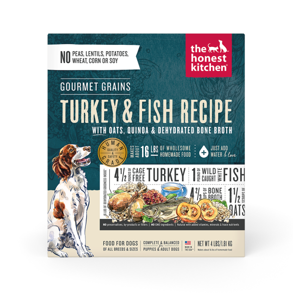 The Honest Kitchen believes human grade, whole foods provide pets the best nutrition possible. This Gourmet Grain recipe is made from ingredients you'd recognize in your own kitchen, like cage free turkey, wild caught fish, organic oats, and quinoa - all dehydrated to retain nutrients and taste. Perfect for picky eaters, they add a big burst of flavorful bone broth and leave out the potatoes, peas, lentils, corn, wheat, and soy. Just add warm water and wait three minutes for a tasty, homemade meal that you and your pets will love!