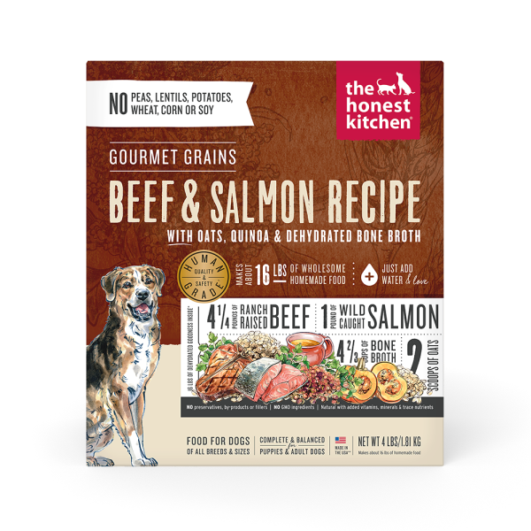 The Honest Kitchen believes human grade, whole foods provide pets the best nutrition possible. This Gourmet Grain recipe is made from ingredients you'd recognize in your own kitchen, like ranch raised beef, wild caught salmon, organic oats and quinoa - all dehydrated to retain nutrients and taste. Perfect for picky eaters, they add a big burst of flavorful bone broth and leave out the potatoes, peas, lentils, corn, wheat, and soy. Just add warm water and wait three minutes for a tasty, homemade meal that you and your pets will love!